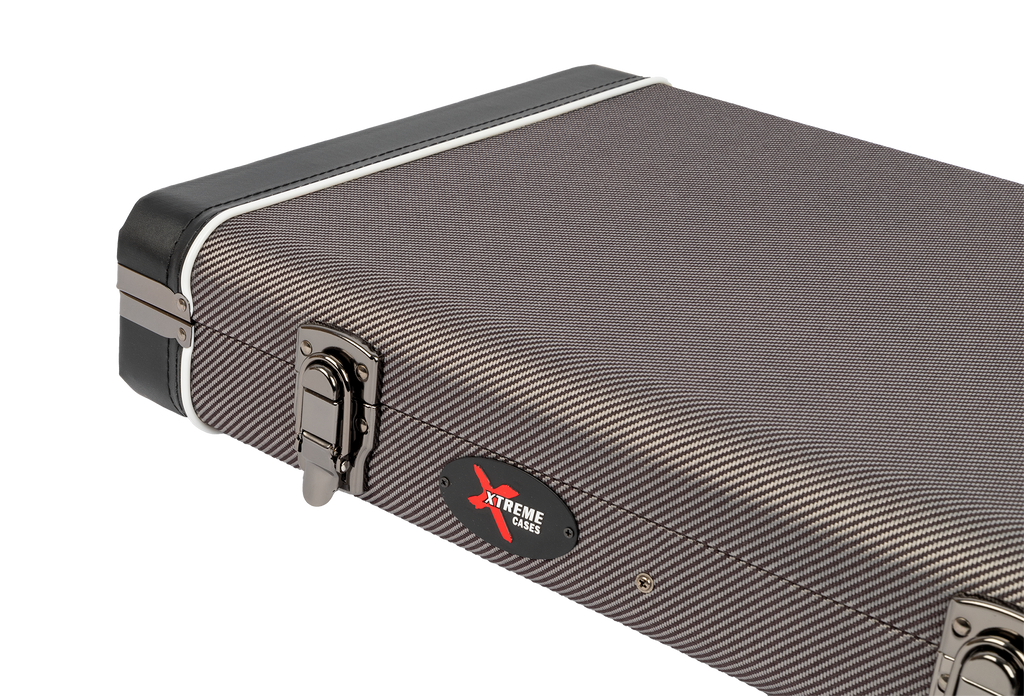 XTREME - Strat®/Tele® vintage rectangular. Plywood covered in vintage grey tweed. Stitched black end caps with white piping. Soft grey plush lined padded interior. Large accessory storage compartment with lid. Dual neck supports. Classic stitched black leatherette handle. 3 deluxe black nickel drawbolt latches with lock. Xtreme logo plate.