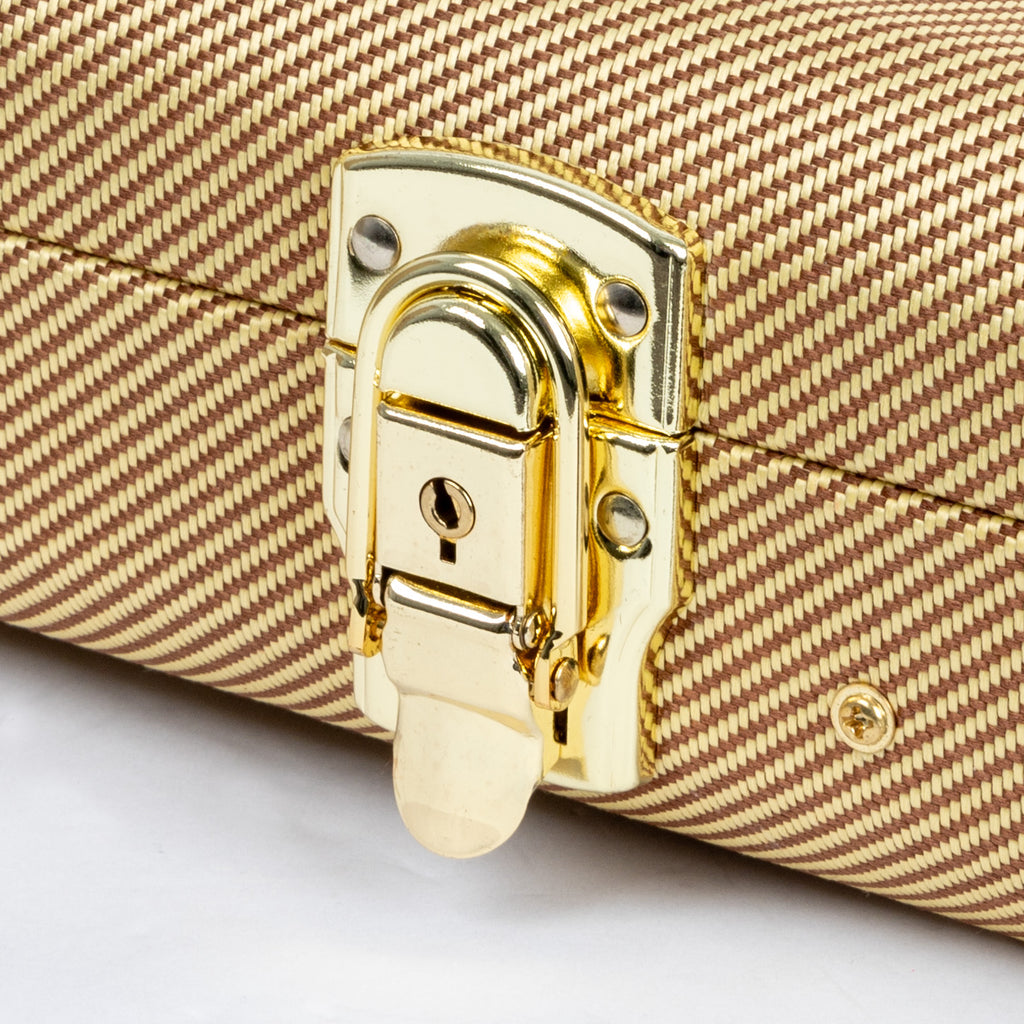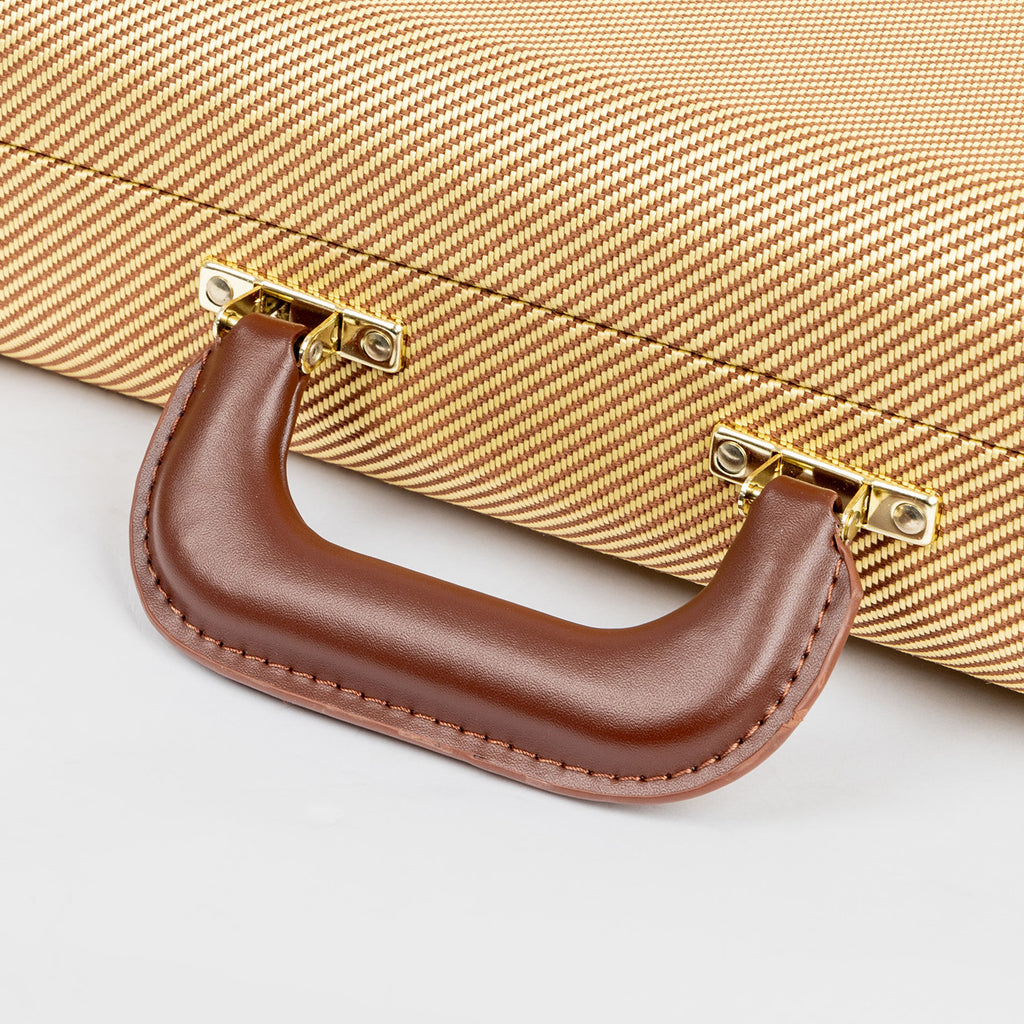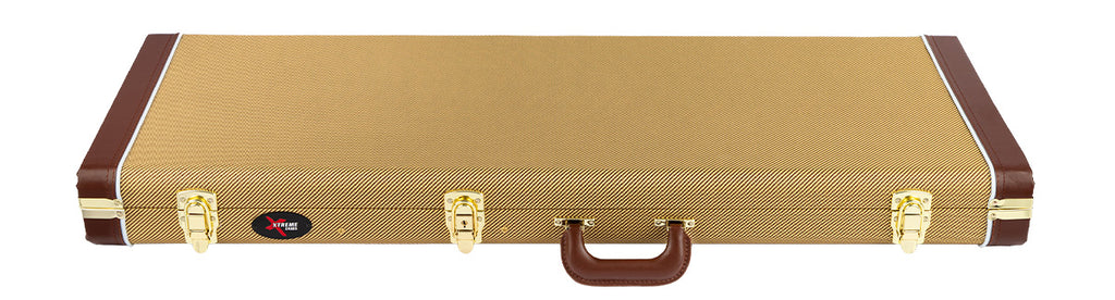 XTREME - Strat®/Tele® vintage rectangular. Plywood covered in vintage yellow tweed. Stitched brown end caps with white piping. Soft burgundy plush lined padded interior. Large accessory storage compartment with lid. Dual neck supports. Classic stitched brown leatherette handle. 3 deluxe gold drawbolt latches with lock. Xtreme logo plate.