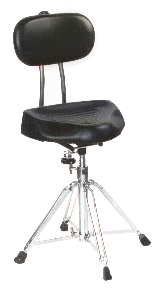 Deluxe drum throne. Heavy duty stool with large padded plush “saddle style” seat. Quick release spindle height adjustment 50cm to 62cm with memory lock. Padded back support attached to "saddle style" seat. Worm screw height adjustable 51cm to 63cm.