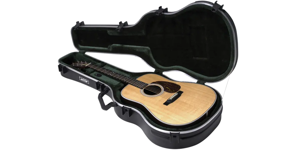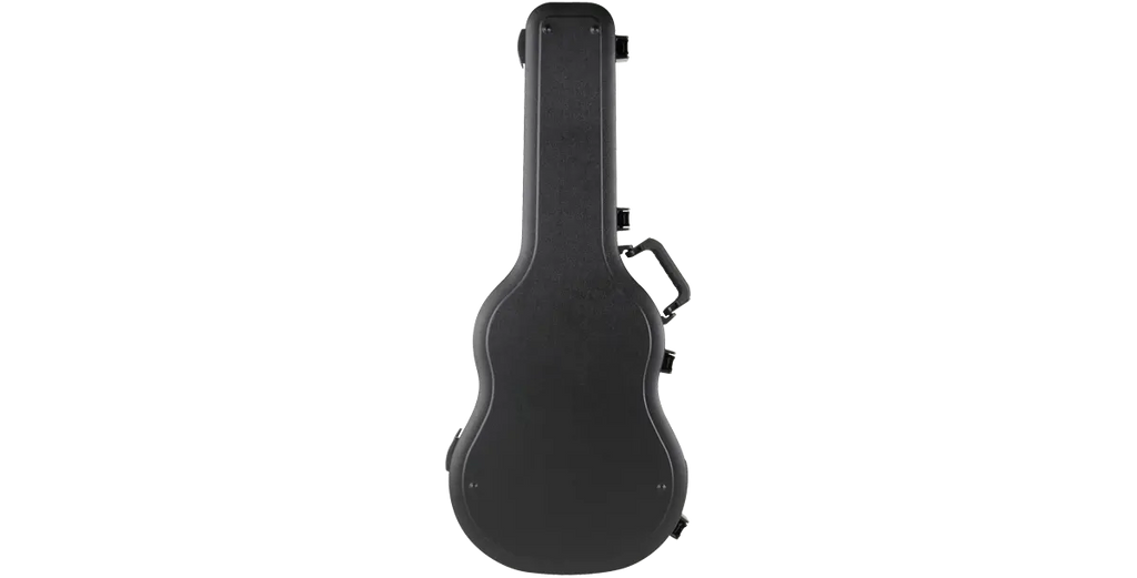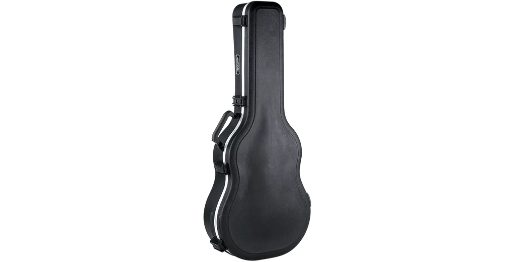 Fits dreadnought and 12 string guitars with a contoured arched lid that will fit knobs on electric models, and features molded-in bumpers for valance protection, rubber over-molded cushion grip handles, and a heavy duty Deluxe Plush interior.
