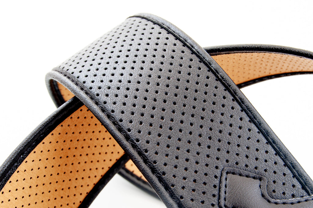 Monte-Carlo Black Guitar Strap: This strap embodies the spirit of classic cars, racing, speed, and engines. When we designed this model, we were inspired by the perforated upholstery of classic racing cars, driving gloves, and the large steering wheels made of bakelite, wood, and metal. The captivating world of motorsport, with its sense of freedom and adventure, even made us think of Steve McQueen, his indomitable spirit, and the smell of burning tires.