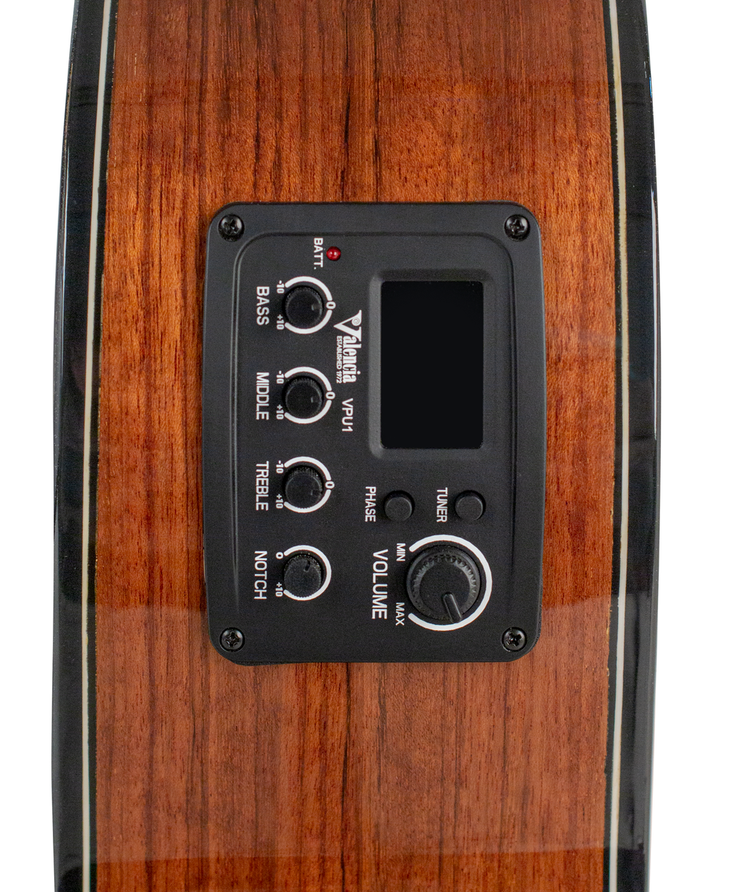Sitka spruce top. Walnut back and sides. ABS 5 ply black/white top binding, 3 ply black/white side and back binding. 5 ply black/white centre back strip. Mahogany neck and ABS black bound Amara ebony fingerboard with nickel frets. Amara ebony veneer headstock and neck heel end. Amara ebony bridge with wood mosaic. Black Graph Tech Canada, NuBone XB compensated saddle. Black nut. Custom gold plated machine heads with black buttons. USA strings. Valencia 3 band EQ preamp with LCD chromatic tuner. Rotary volume, bass, mid, treble and notch controls. Tuner and phase switches. Low battery LED. 9 volt battery. Piezo under-saddle pickup.