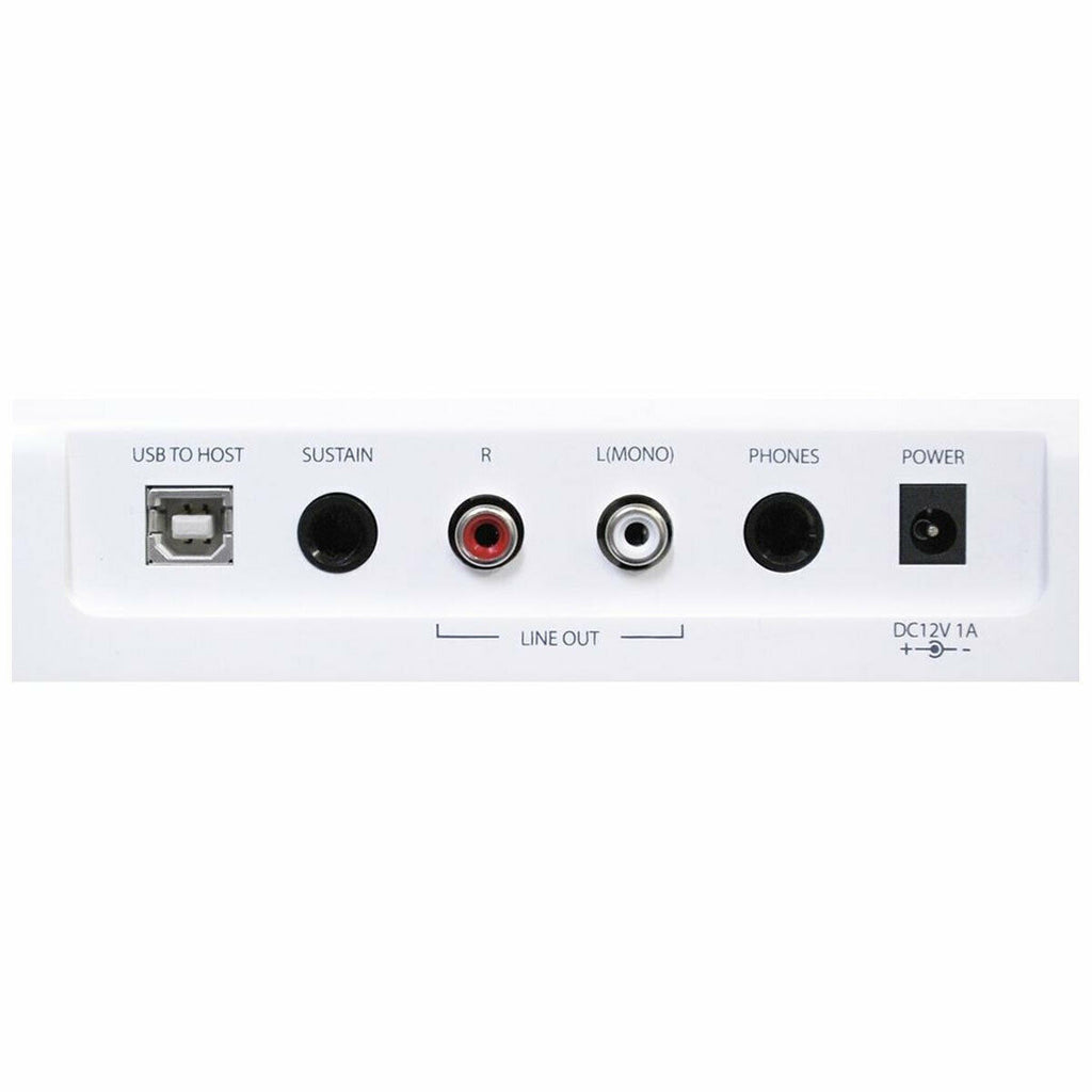 61 Semi weighted touch sensitive keys. 8 Quality sounds, built in speakers, USB connectivity, reverb, chorus and EQ. Includes, Power supply, sustain pedal and music holder. White finish.